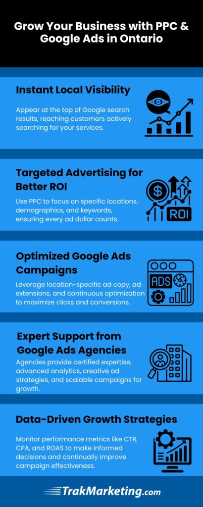 Yes, Trak Marketing specializes in PPC and Google Ads management for businesses in Ontario. They help local companies in London and beyond optimize campaigns, attract qualified leads, and achieve sustainable growth with data-driven strategies.
