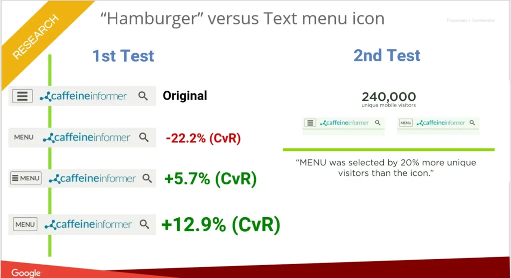 This does not mean that users do not understand the hamburger/sandwich – it could be that the word MENU draws more attention. Even more interesting is that changing your icon to the menu has the potential to increase conversions by 12%! Making sure that you understand this type of user experience research will help you design a better experience for your visitors.